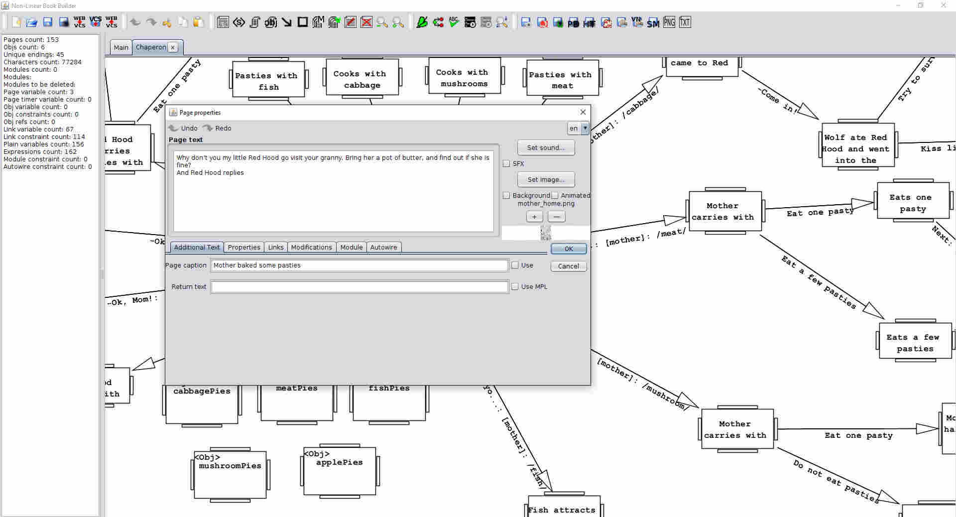 NLBB means Non-Linear Book Builder, in other words "non-linear books creator". But don't get confused by the simplicity of its name, because NLBB has a wide variety of possibilities. You can create Visual Novels, Point and Click, Hidden Object with it, and also popular text stories Choice Of Games. All our games are made in NLBB. The editor is absolutely free and open-source. I started working on it two years ago, and still improving by adding new functions. The major advantage of NLBB is that it's visual. A paragraph is shown as a rectangle, and a transition between paragraphs is shown as an arrow.